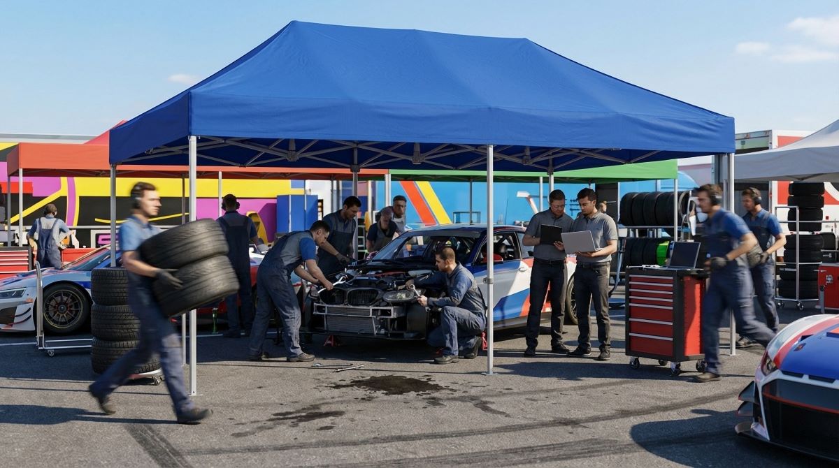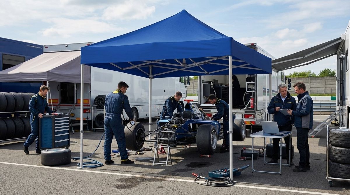 Ett depåtält är konstruerat för att klara intensiv användning där funktion går före dekoration. Det används som arbetsplats, servicezon eller tillfälligt skydd för utrustning och fordon. EasyUP depåtält skapar en avgränsad och praktisk yta där team kan arbeta effektivt, hålla ordning på material och snabbt komma åt verktyg – oavsett om det handlar om motorsport, idrottsevenemang eller fältarbete.