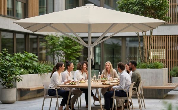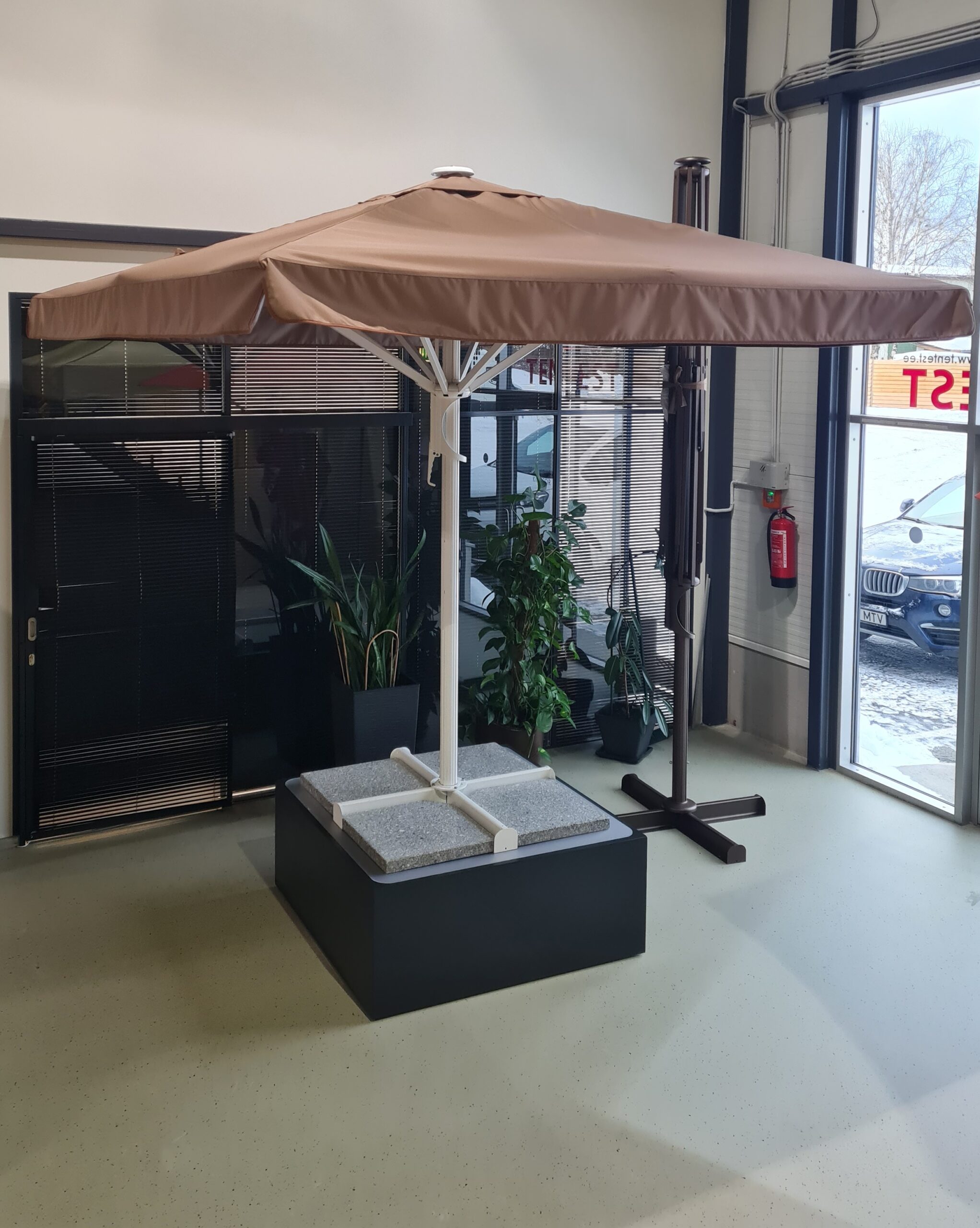 Detta premium parasoll med mittstång är idealiskt för utomhusevent, trädgårdar, terrasser och uteserveringar. Parasollet har ett enkelt öppningssystem och en täckning i slitstark, vatten- och UV-beständig polyester som dessutom är brandsäker. Ramen är tillverkad i vit aluminium och parasollet har en kubformad design som ger ett stilrent och modernt intryck.